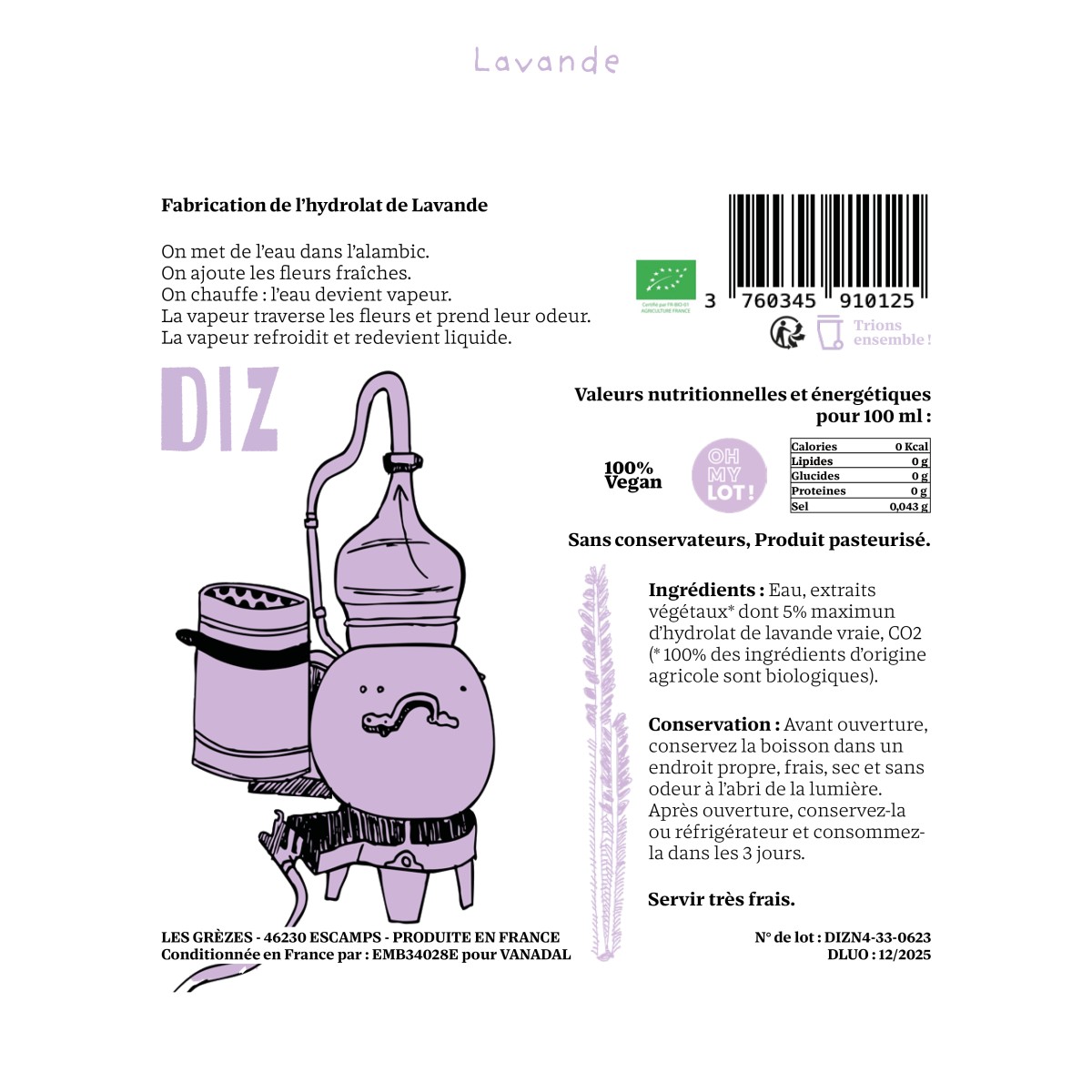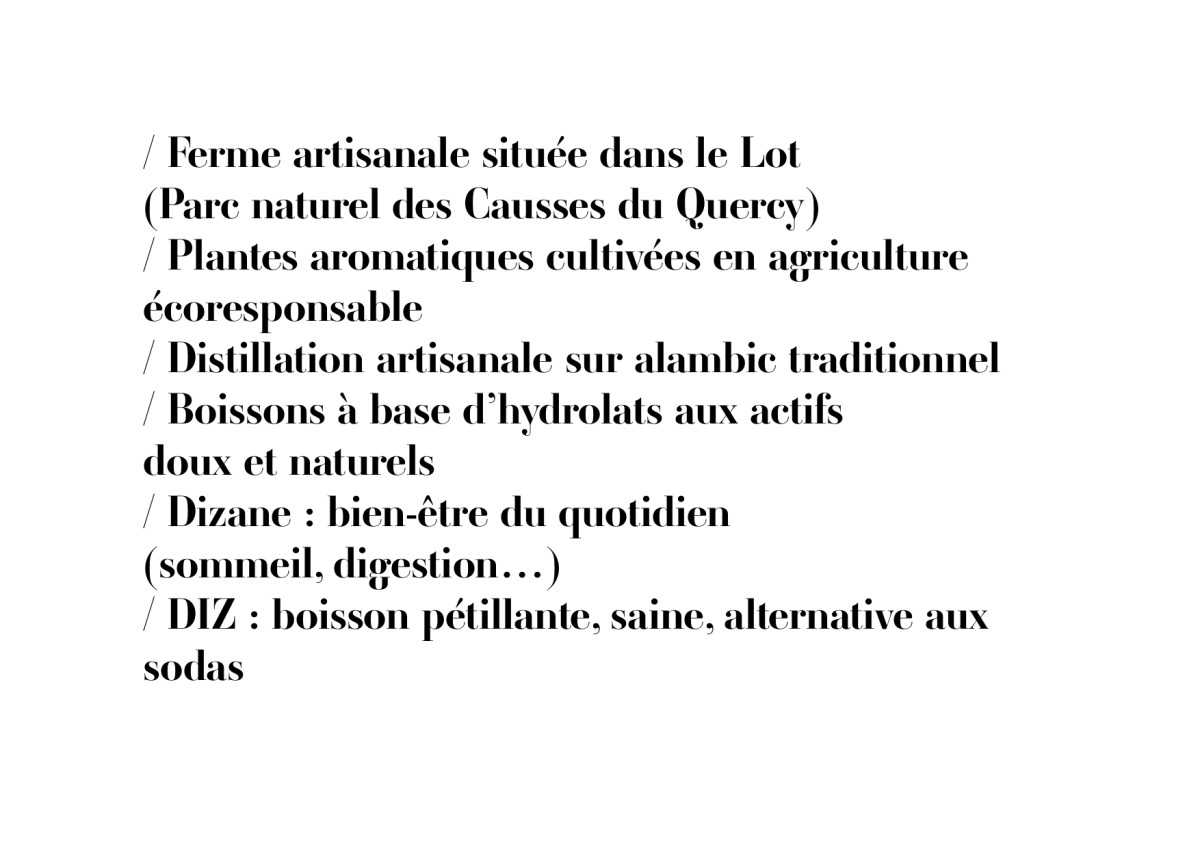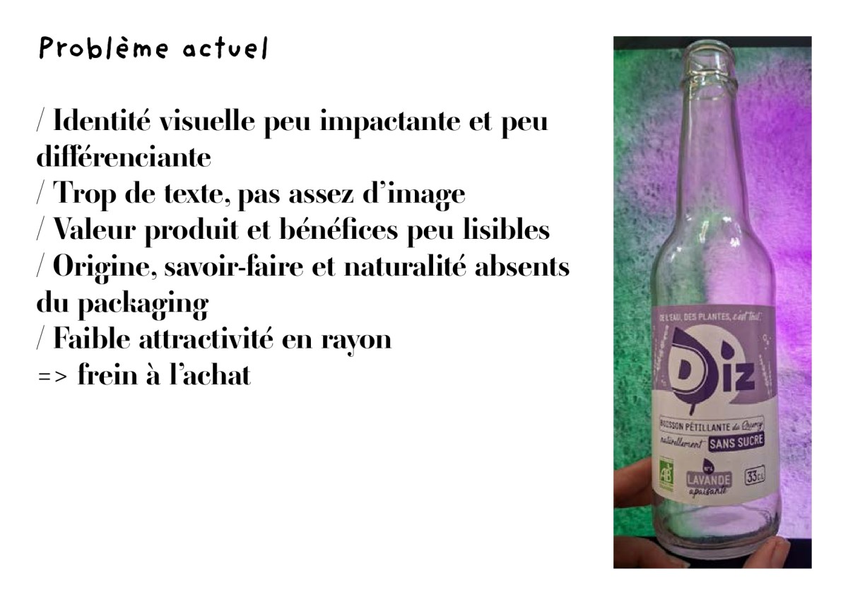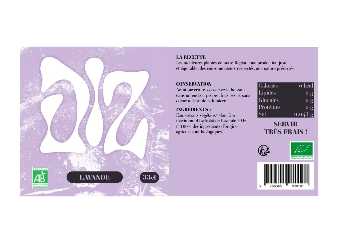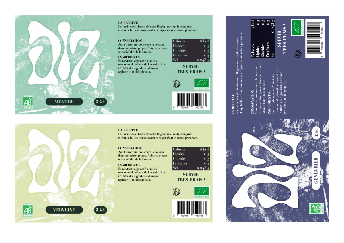 Ce projet porte sur la refonte de l’identité visuelle de Diz, une boisson naturelle élaborée à partir d’hydrolats de lavande, de genévrier, de menthe et de verveine. Il s’inscrit dans le cadre d’une commande réelle, formulée par Benjamin, producteur à la ferme de Vanadal et créateur de la boisson. Le travail a été mené collectivement par Titouan Lallauret, Tristan Di Felice, Lalie Delle-Vedove, Thomas Bremond et Rita Paicheler, en réponse aux enjeux de positionnement et de valorisation du produit.