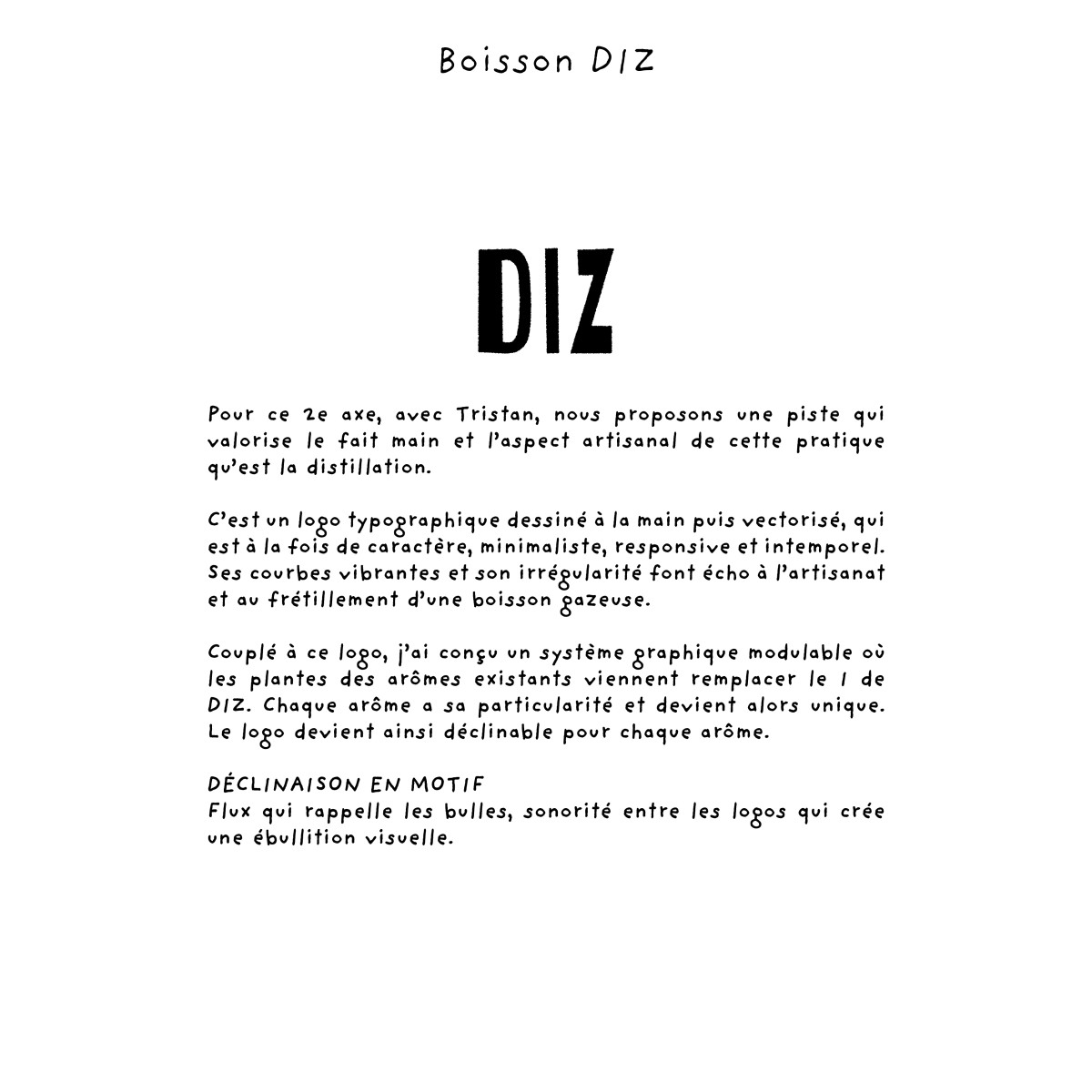 La recherche graphique s’est articulée autour de deux axes créatifs distincts : le premier mettait en avant le caractère pétillant et rafraîchissant de la Diz et le second, cherchait à souligner sa dimension artisanale et naturelle.