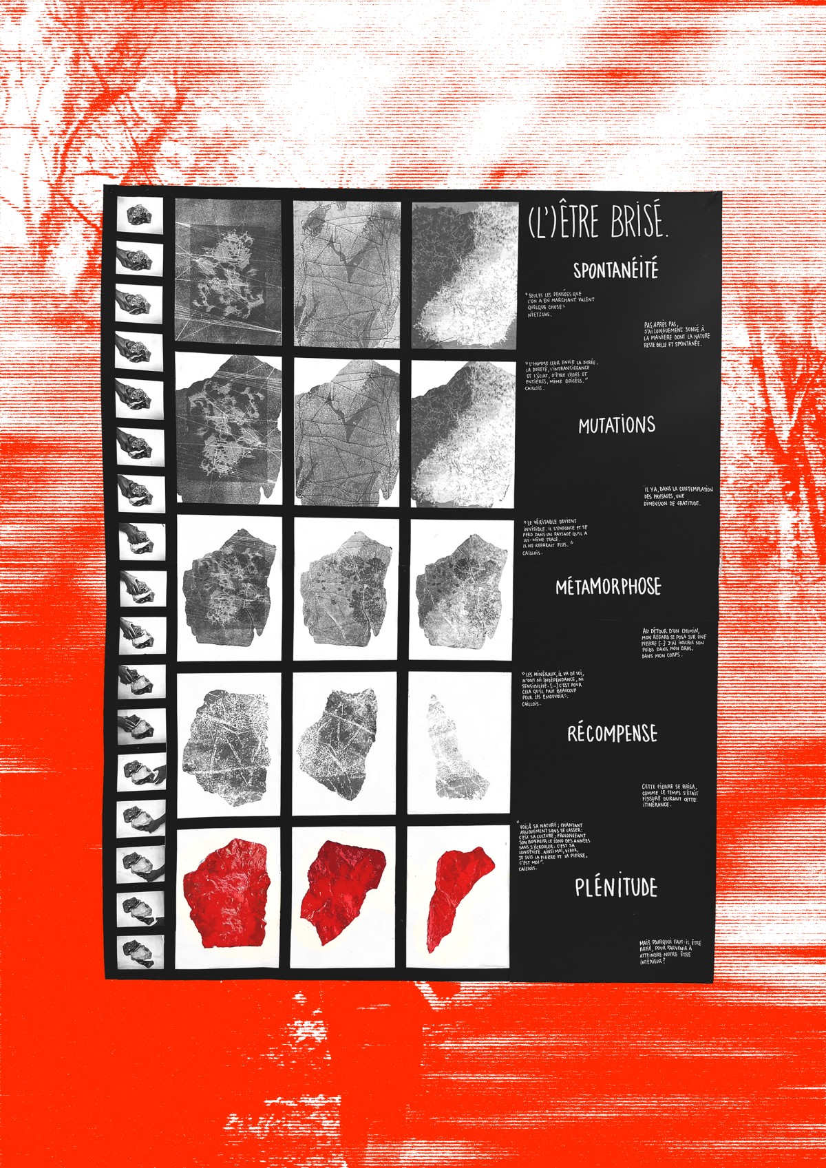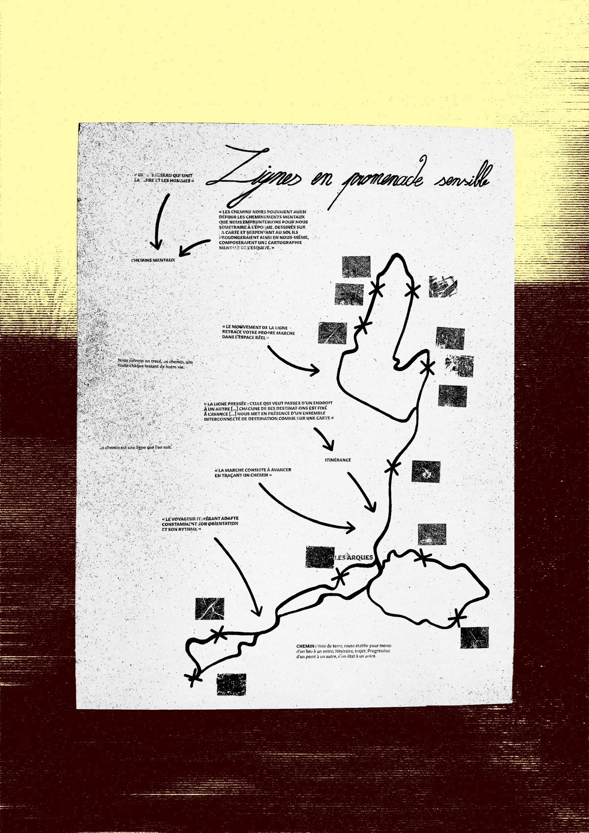 Le projet se construit en deux temps complémentaires. Le premier consiste en un inventaire libre de formes et de formats, issu de l’observation et de la marche. Le second prend la forme d’un travail d’atelier, basé sur une sélection et une mise en relation d’images imprimées, réunies dans un poster, permettant de restituer et de prolonger l’expérience du parcours.