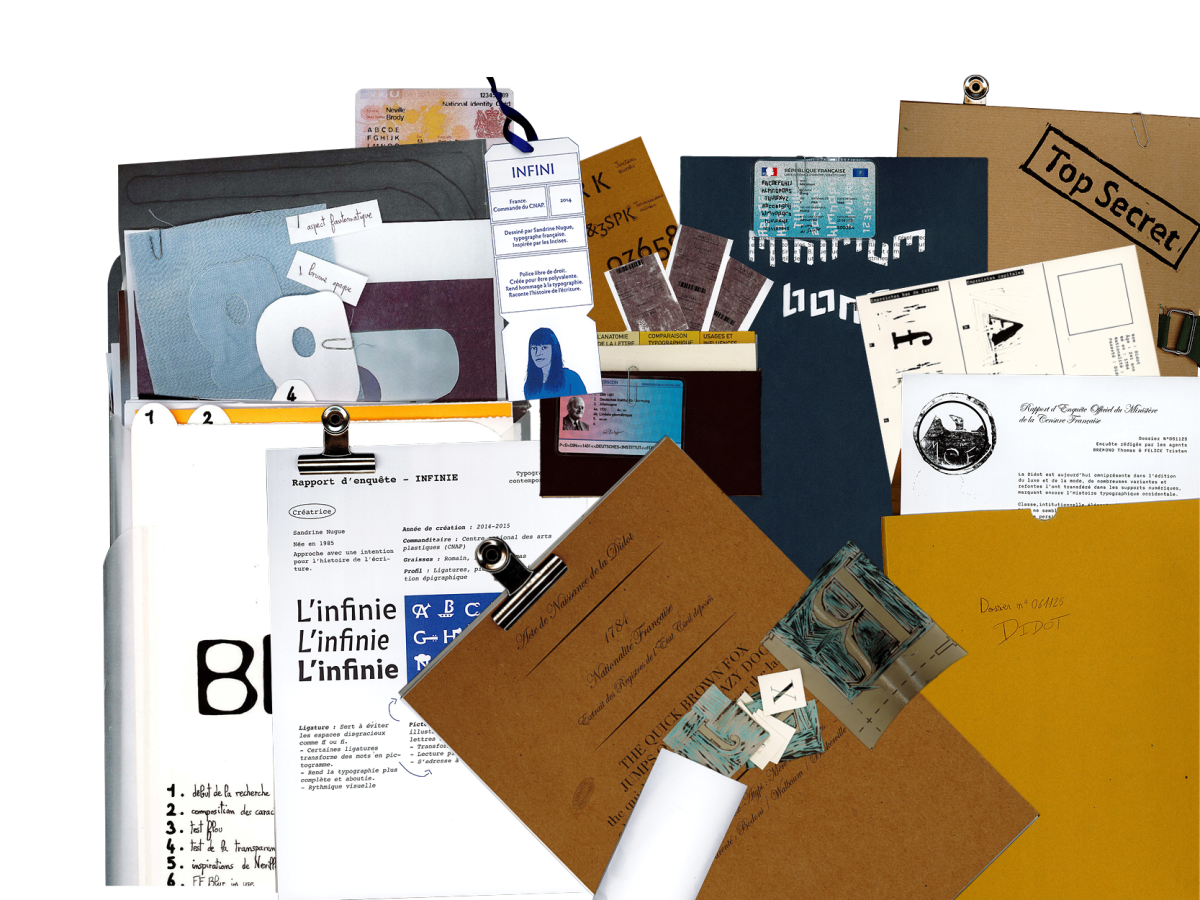 Les binômes enquêteurs ont dût chacun monter un dossier d'investigation sur une de ces typographies, retracer son parcours au fur et à mesure du temps, pister les supports dans lesquels elle domicile ; consigner tout les éléments d'identification qui en font sa forme (pleins et déliés, empattements, grille de construction, gestes, fûts etc.) et donc la singularité de ses caractères.