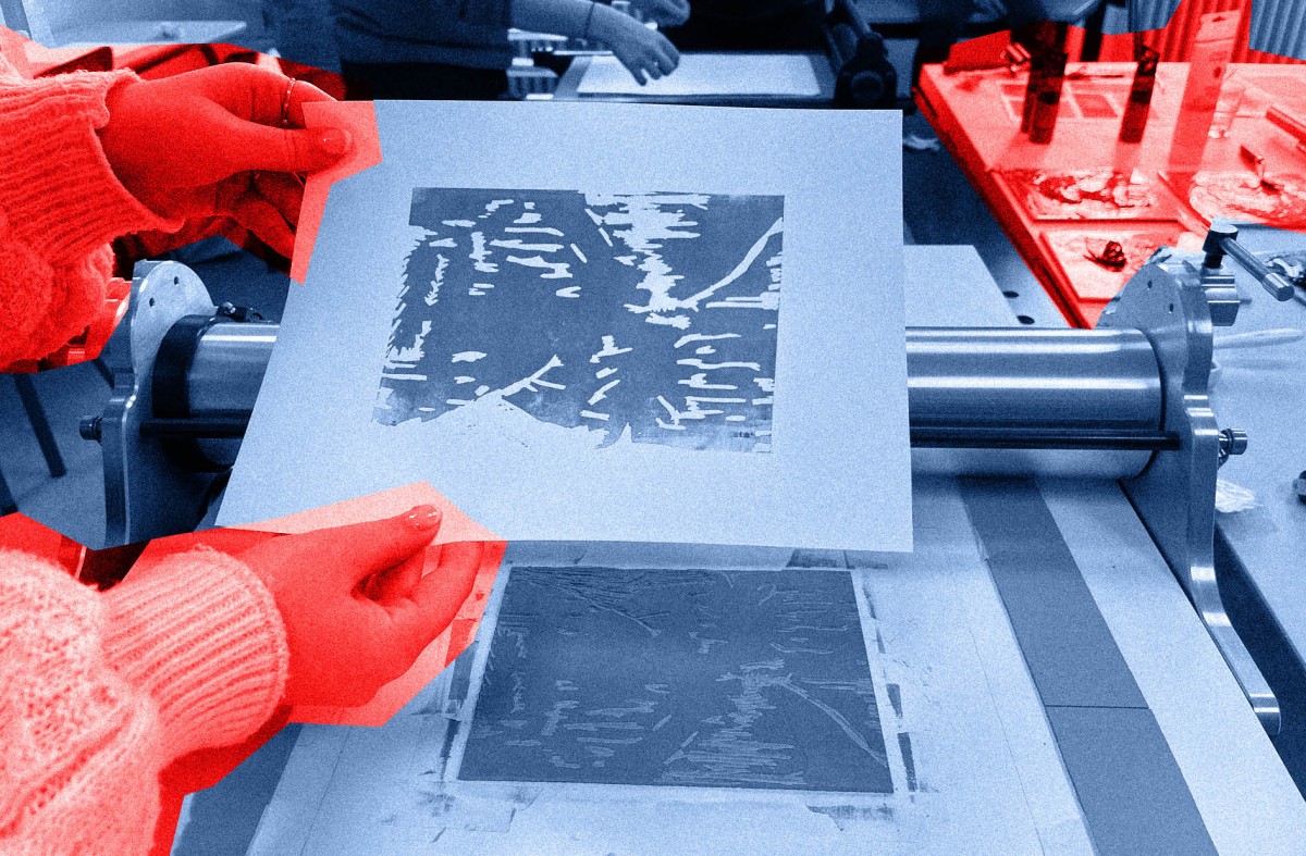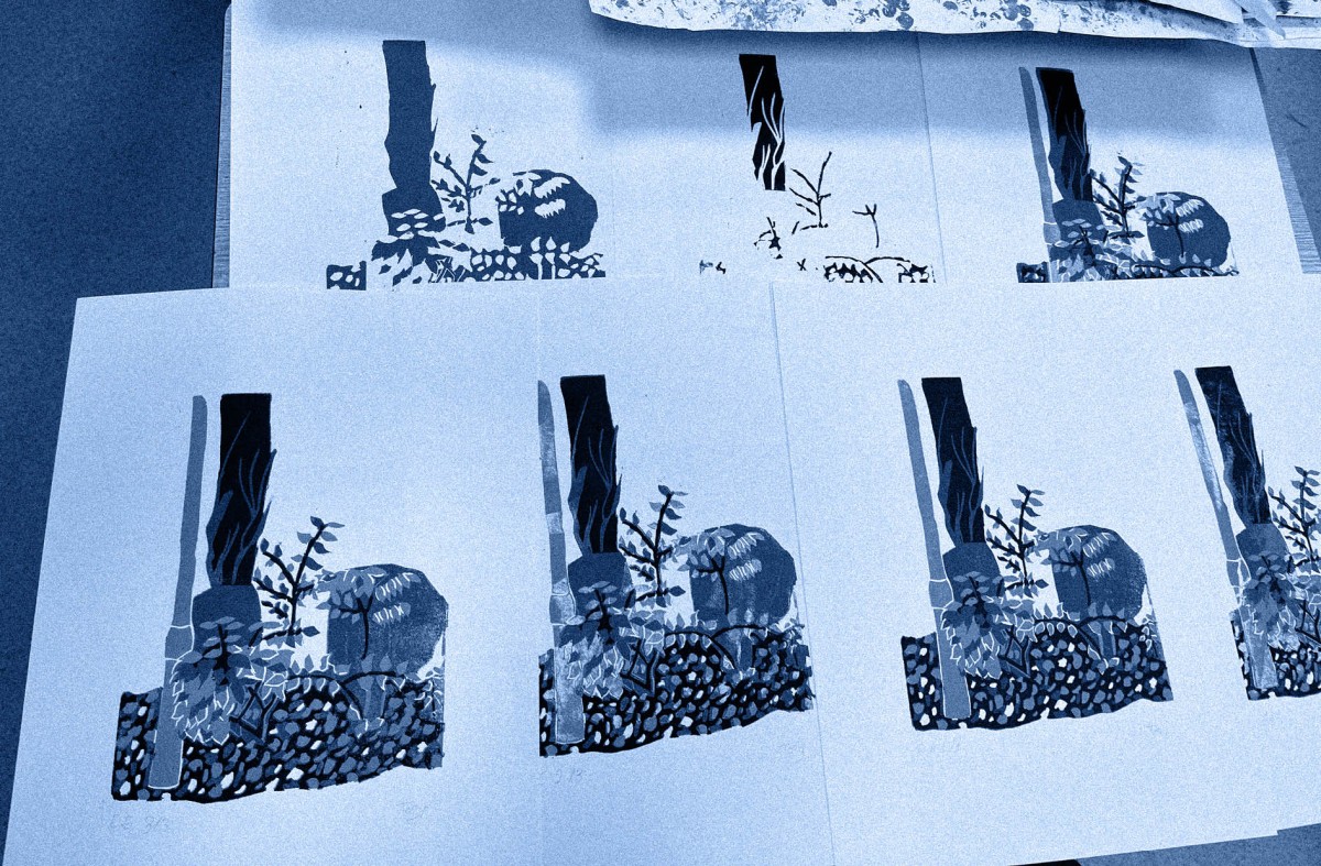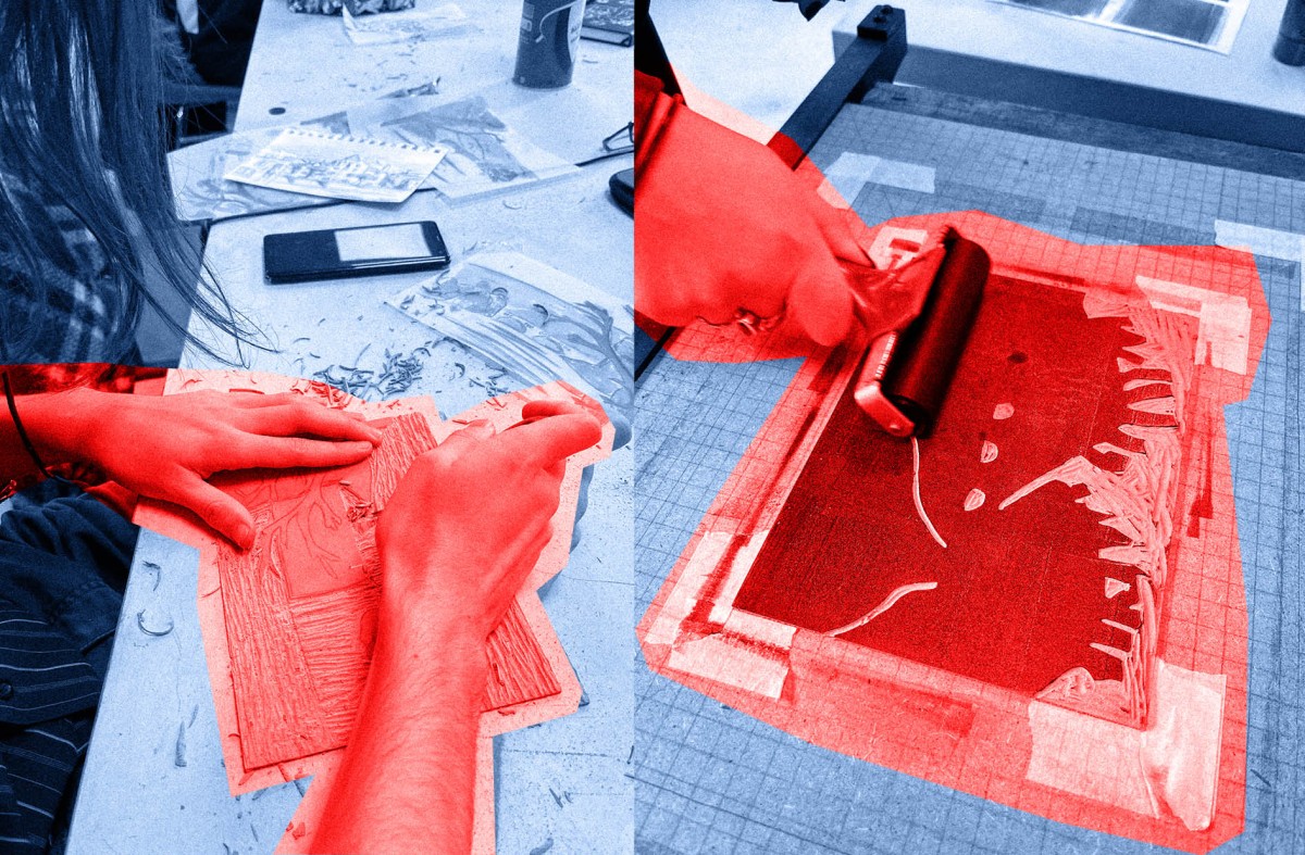 À partir d’un dessin choisi, il fallait ensuite engager un travail de linogravure en plaque perdue, décliné en trois états successifs. Chaque étape comprenait la préparation de la matrice, la gravure, puis l’impression avec essais et tirages finaux. Le projet se concluait par la numérotation, la signature des estampes, un accrochage collectif et un temps de retour critique sur les productions réalisées